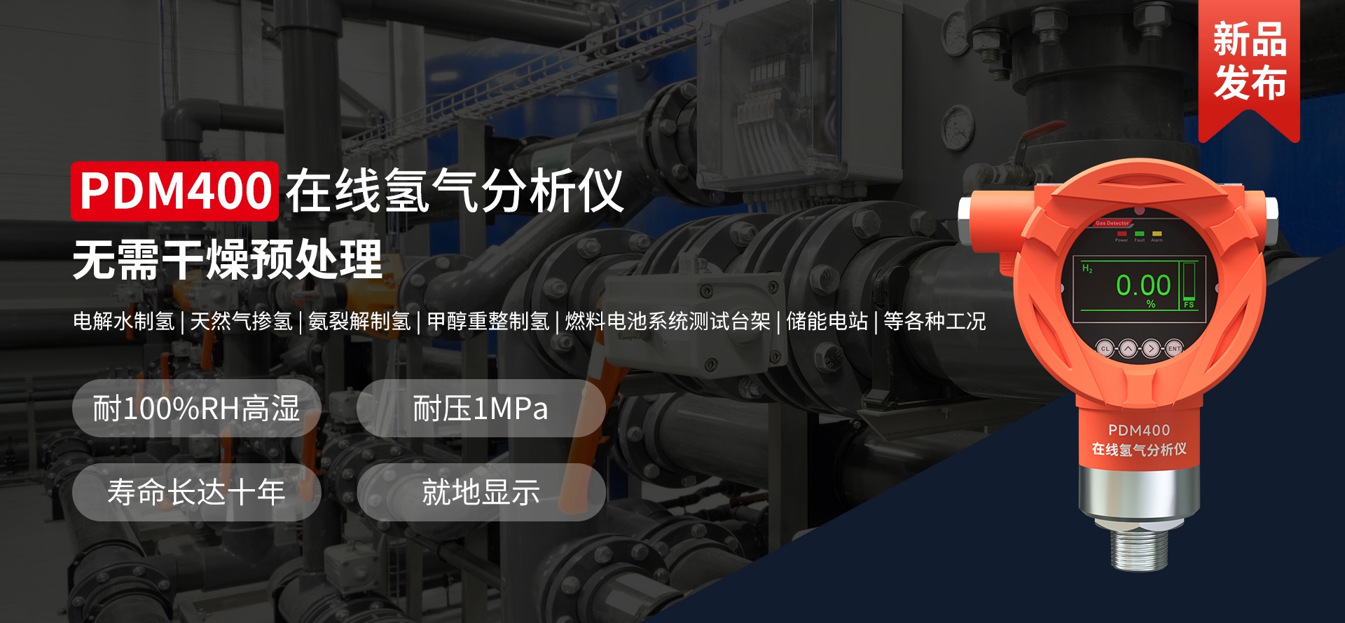 電解水、天然氣、氫分裂制氫,輸氫管道、氫氣置換,制氫站、加氫機(jī)、卸氣柱、撬裝站、氫燃料電池汽車及系統(tǒng)測試臺架、熱電聯(lián)供、氫滲氫實(shí)驗(yàn)室、涉氫生產(chǎn)廠房、氫氣氣瓶間等場合中的氫氣濃度、純度、濕度檢測。